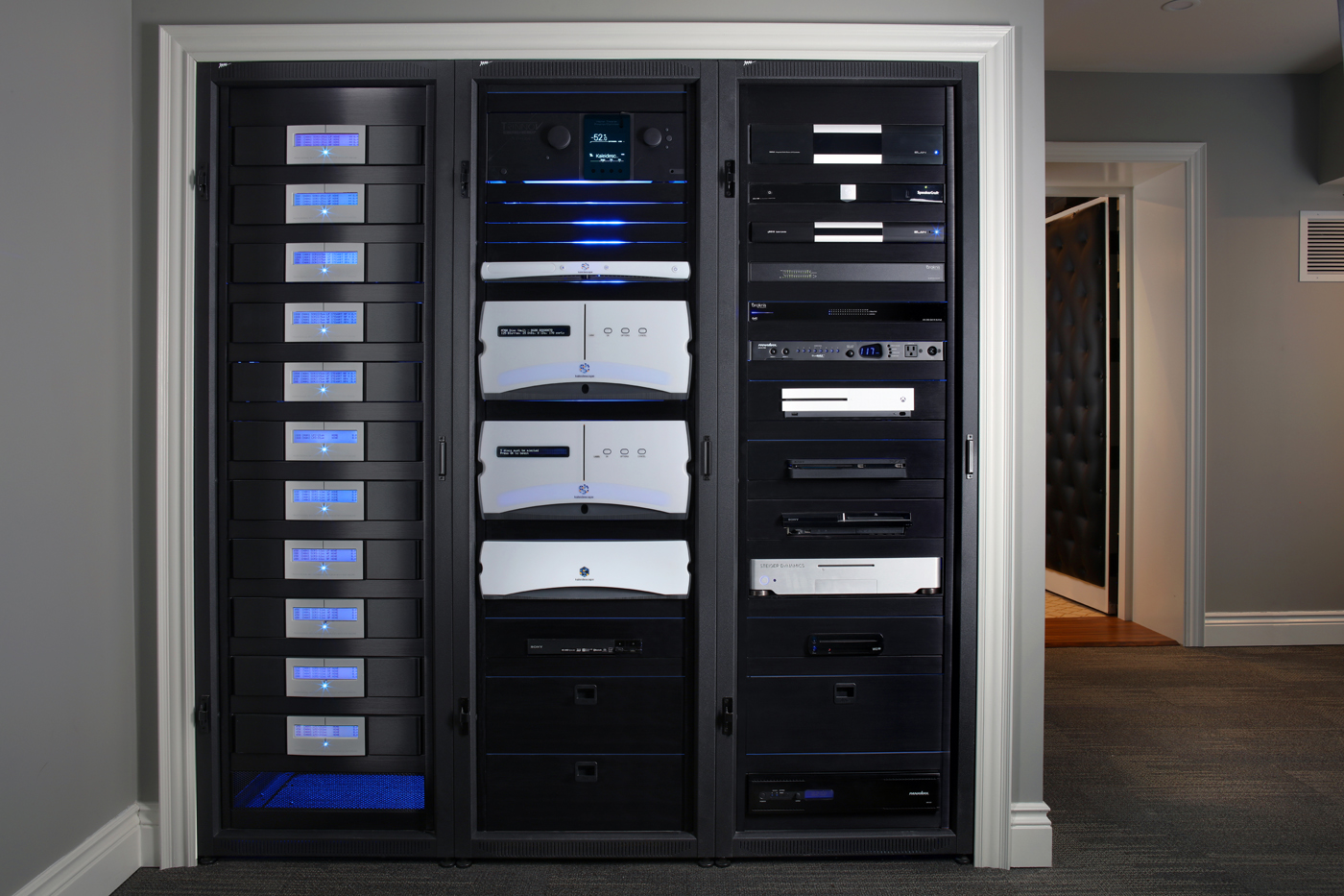 The days of placing equipment in cabinets or under the TV is passé. In today’s modern home systems all electronic equipment is housed neatly in proper equipment racks. This allows us to not only actively cool and protect all the critical items in a home system, but also provides ONE point of service.