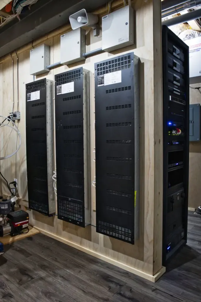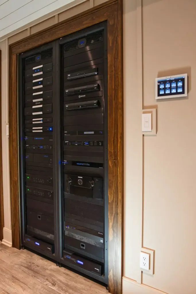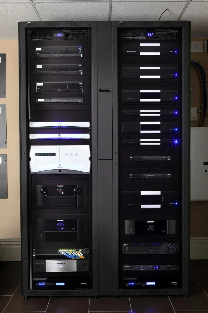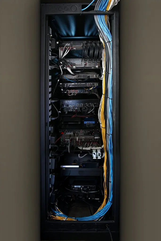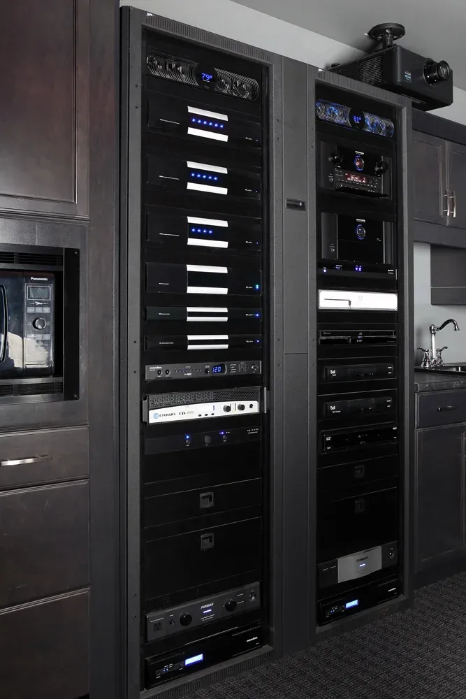 The days of placing equipment in cabinets or under the TV is passé. In today’s modern home systems all electronic equipment is housed neatly in proper equipment racks. This allows us to not only actively cool and protect all the critical items in a home system, but also provides ONE point of service.