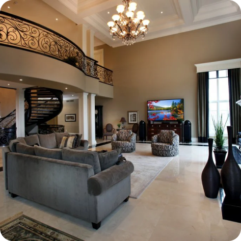 The system consists of 132 Lighting and Fan loads, 36 Motorized Roller Shades, 11 Security Cameras, Alarm System with 2 partitions and 85 zones, Humidity Monitoring, Temperature monitoring, Gate Control, Garage Door Control (5 of them), 13 zones of Video, 17 zones of Distributed Audio and a full Anamorphic Theater Room.